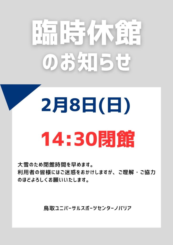 2月8日、現在、布勢総合運動公園内は断続的に積雪をともなう雪が降り、今後も大雪が見込まれることから、ノバリアは本日14:30にて臨時閉館とします。